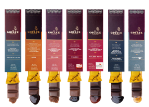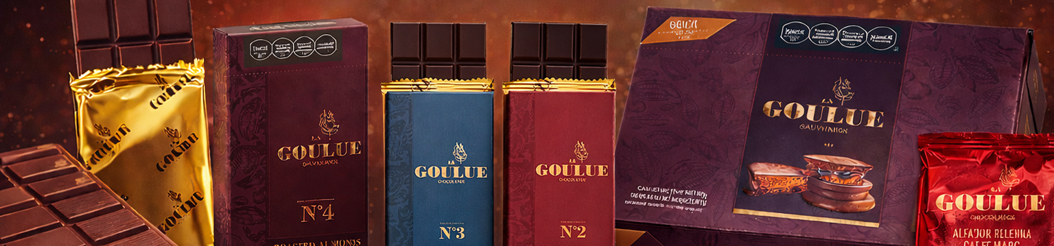 Las barras de chocolate La Goulue Chocolatier son productos artesanales premium, reconocidos por sus rellenos intensos y únicos, que combinan chocolate belga con reducciones de vinos argentinos (Malbec, Cabernet, Torrontés), cerveza artesanal, dulce de leche o naranja.