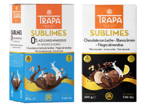 Presentados en estuches de 155 g y 200 g, los Bombones TRAPA Sublimes cuentan con un empaque elegante y atractivo, ideal para regalar o compartir. Disponibles en una cuidada selección de variedades que combinan chocolate con leche, chocolate negro y chocolate blanco limón, todos rellenos con almendras, además de una opción 0% azúcares añadidos. Una presentación pensada para disfrutar del chocolate con estilo y calidad.