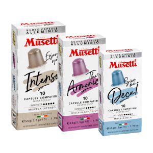 Disfrutá la tradición del espresso italiano en segundos con las cápsulas Caffé Musetti compatibles con máquinas Nespresso®.