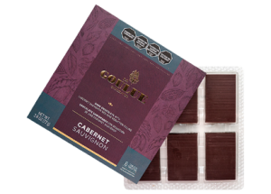 Los estuches de La Goulue Chocolatier son presentaciones gourmet de chocolates artesanales y alfajores rellenos con reducciones de vinos argentinos de alta gama (Malbec, Torrontés, Cabernet, Extra Brut).